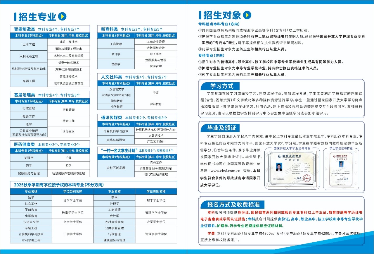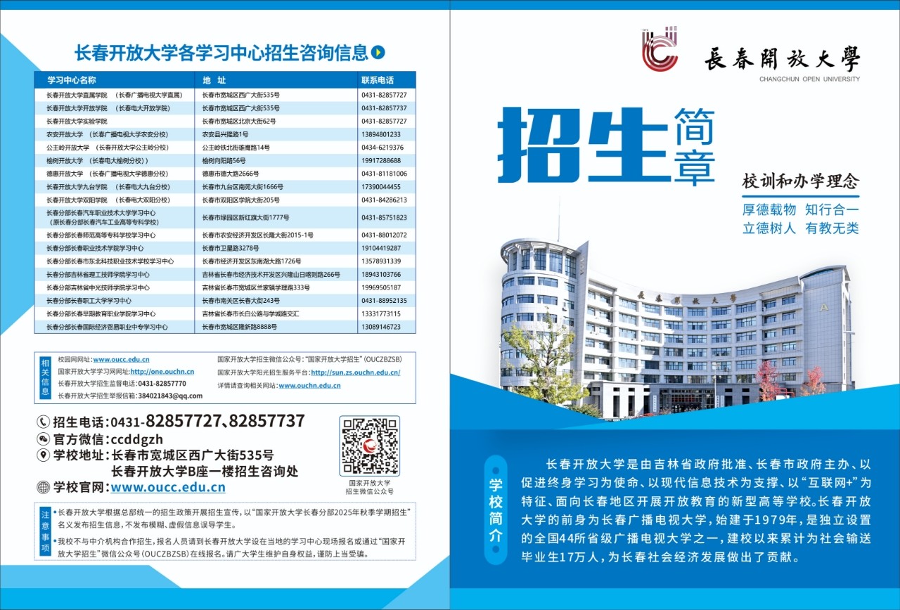 长春开放大学根据总部统一的招生政策开展招生宣传,以“国家开放大学长春分部2025年春季学期招生”名义发布招生信息,不发布模糊、虚假信息误导学生。