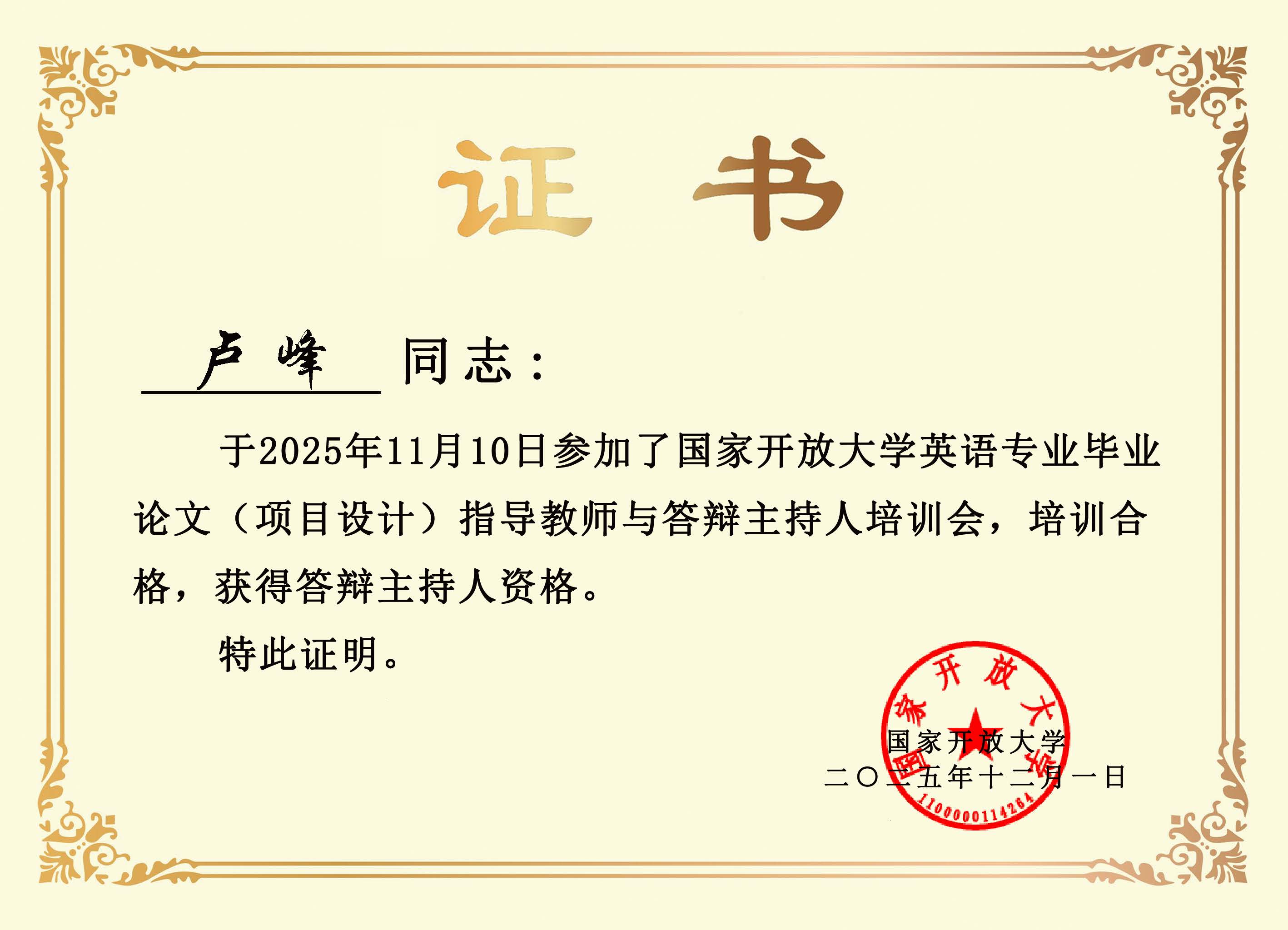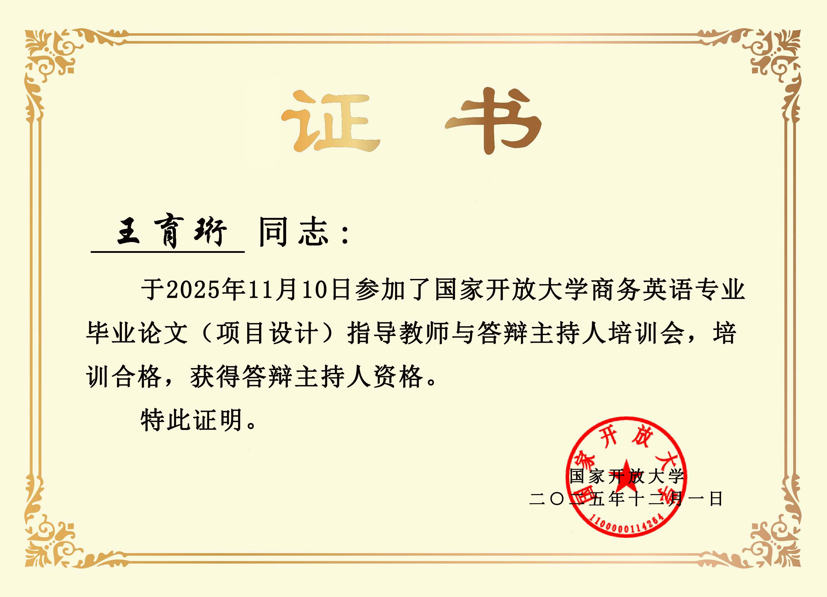 国家开放大学英语专业答辩主持人与论文指导教师资格认证,是对开放教育领域教师学术能力与教学水平的双重权威认可。其中,答辩主持人资格要求教师熟练掌握论文评审标准,具备统筹答辩流程、把控学术规范、精准点评指导的专业能力;论文指导教师资格则对教师的选题指导、论文撰写辅导、学术把关能力提出严格要求。两项资质的获取,不仅是对教师个人专业能力的高度肯定,更是我系重视师资培养、深耕教学质量的生动体现。