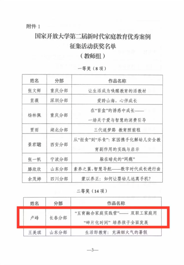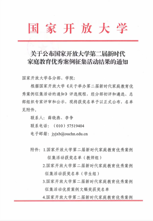 长春开放大学文法系在国家开放大学第二届新时代家庭教育优秀案例征集活动中喜获多项大奖!
