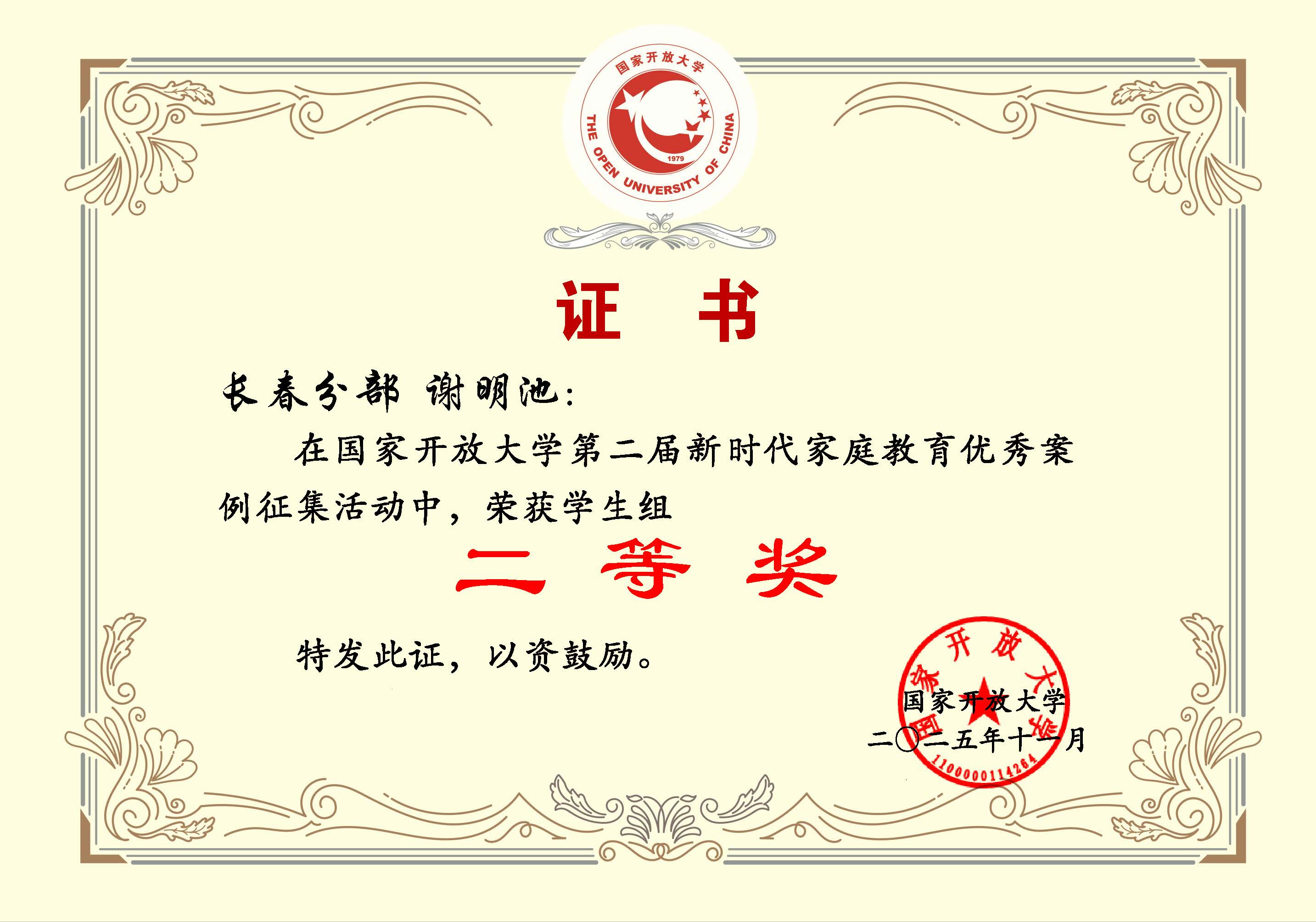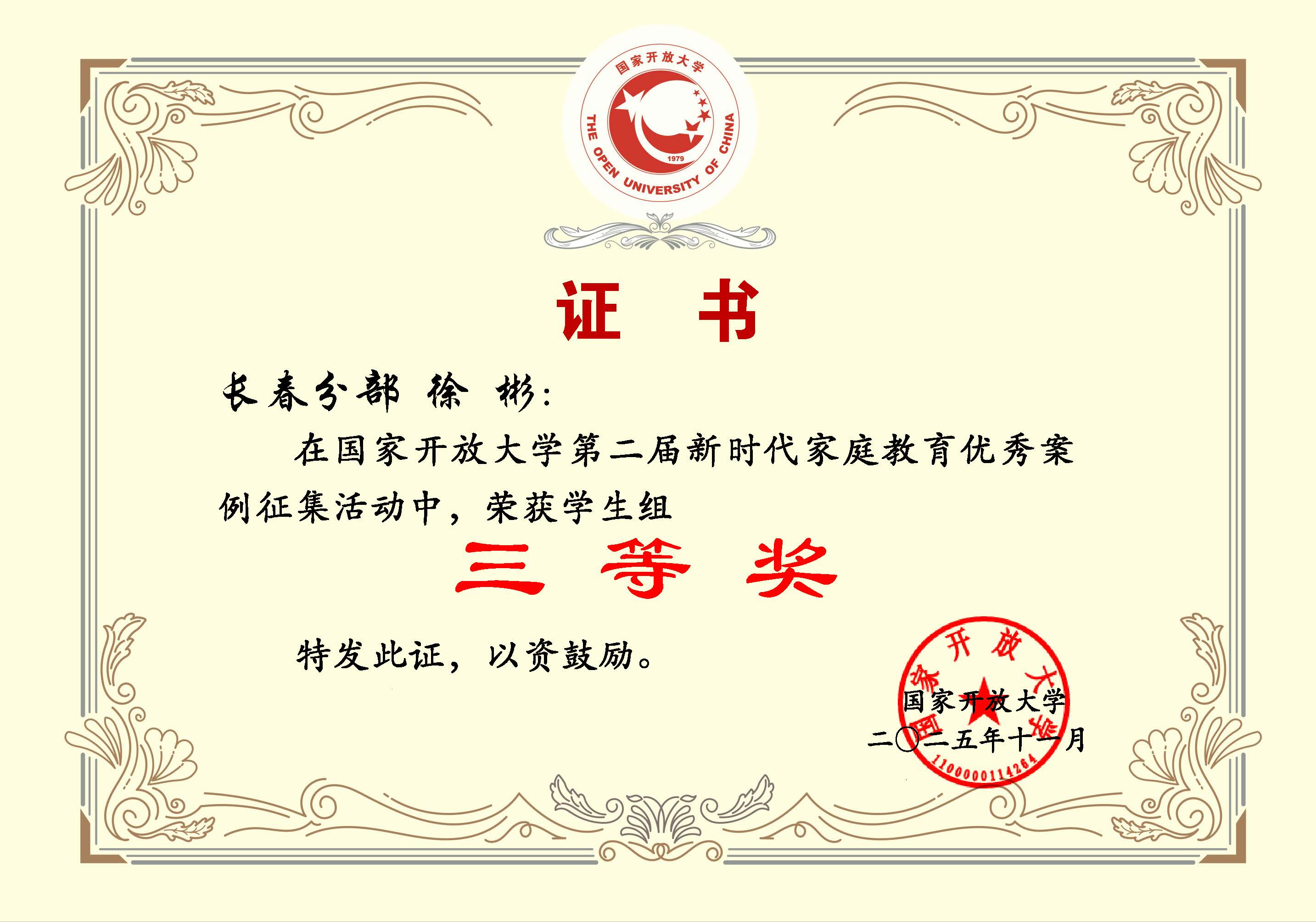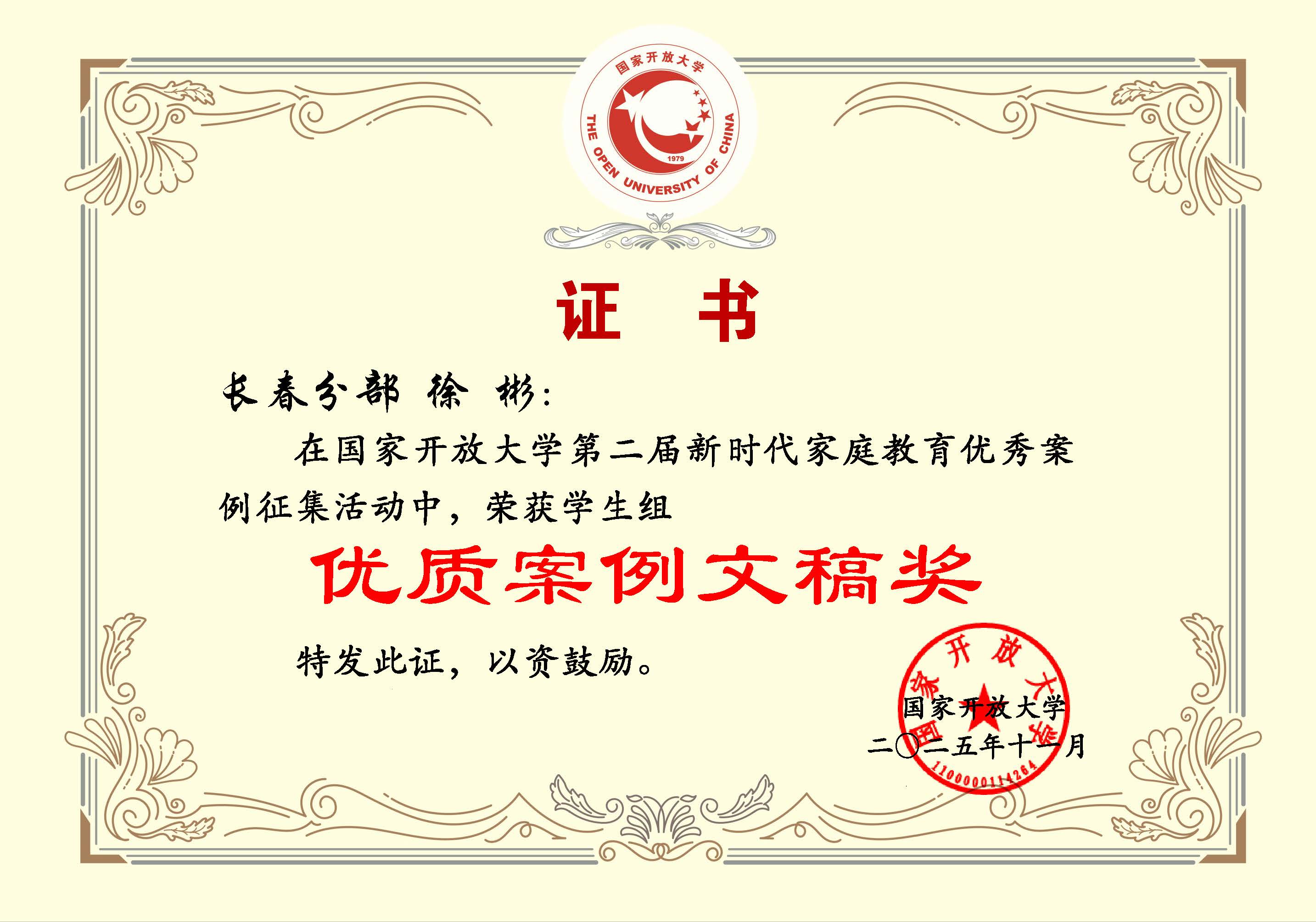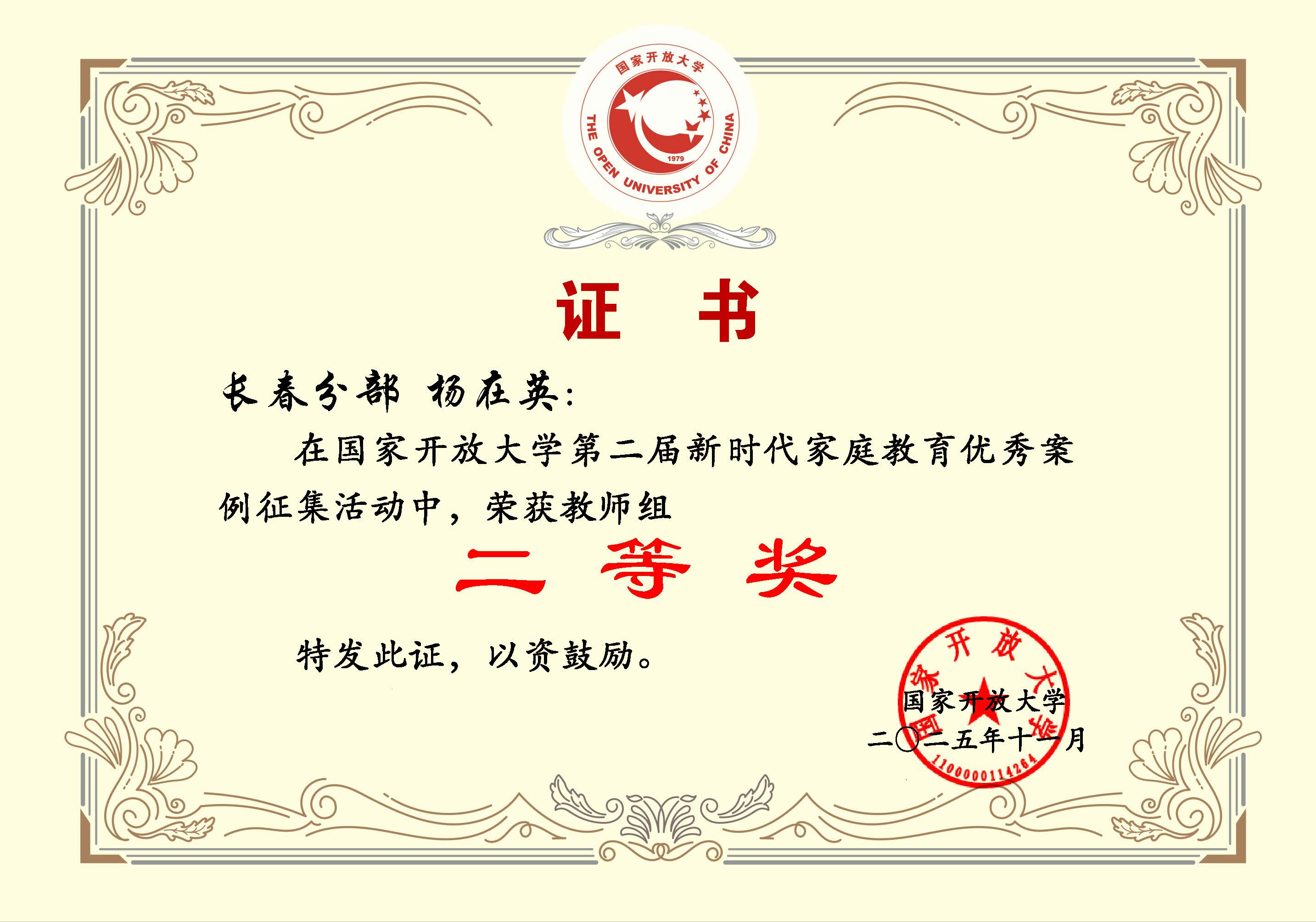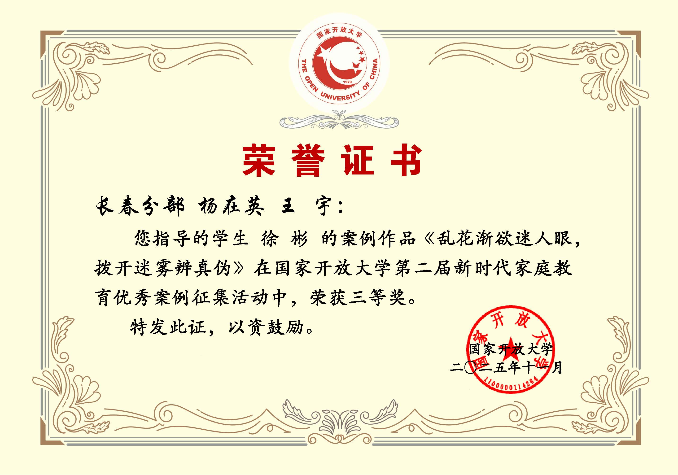 颁奖仪式上,组委会隆重表彰了本届案例征集活动中表现突出的个人与单位。长春开放大学荣获组织奖。我校教师卢峰、杨在英荣获教师组二等奖;学生谢明池(指导教师王斯莹)荣获二等奖,徐彬(指导教师杨在英 王宇)荣获学生组三等奖。教师杨在英荣获教师组优质案例文稿奖,徐彬荣获学生组优质案例文稿奖。这彰显了我校在家庭教育研究与实践、组织动员与指导服务等方面的扎实功底与突出贡献。