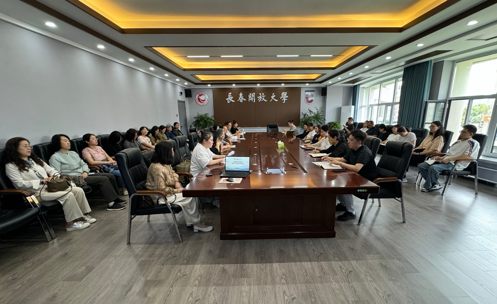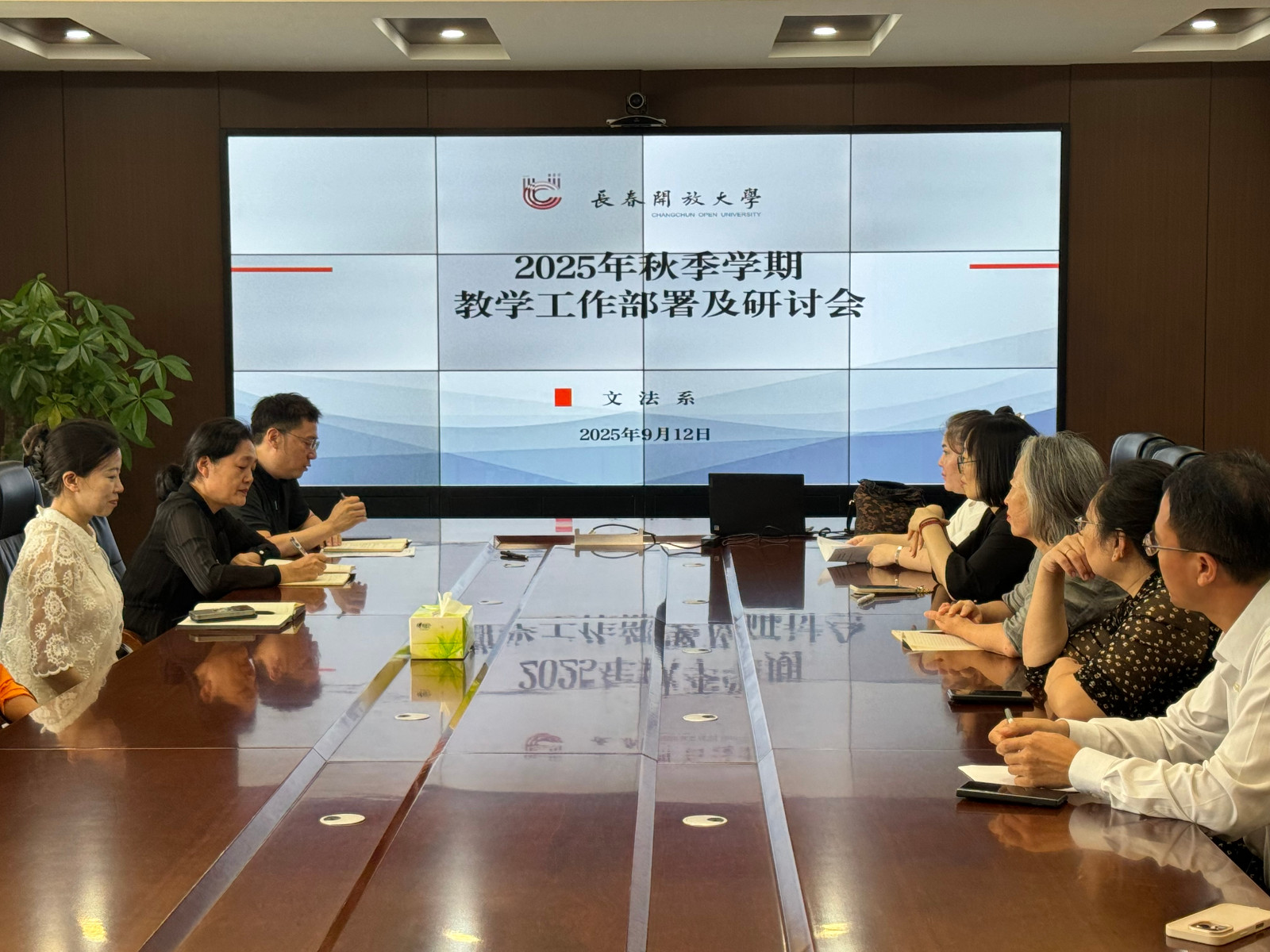 长春开放大学文法系于9月13日在A座三楼会议室组织召开了“2025年秋季学期教学工作部署及研讨会”。会议由文法系主任谢巧稚主持,副主任卢峰进行讲解传答,系全体教师积极参与,共同围绕新学期教学任务与资源建设展开深入交流与研讨。