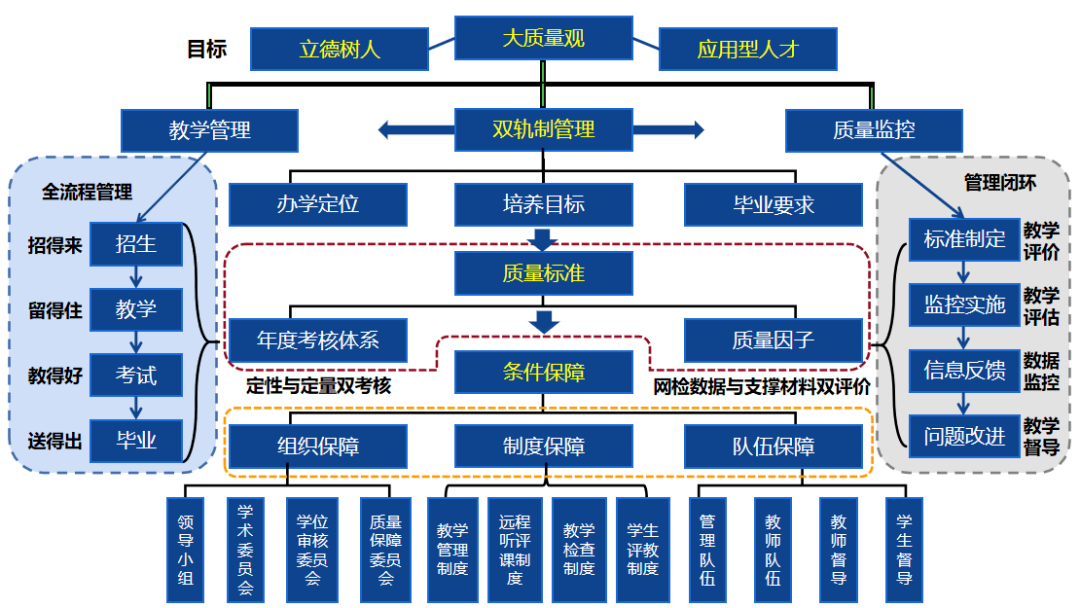 “十四五”期间,学校系统构建起以学术委员会、学位审核委员会、教学质量保证委员会为核心的多层次治理架构,形成“依法治校、专家治学”的治理格局。创新建立“三位一体全覆盖”质量管理模式与“333”质量监控与保障体系,建设运行大数据监控平台,实现对开放教育教学全过程的动态监控。先后编印2023版、2024版《教学教务管理制度汇编》,系统制定涵盖招生、教学、考试、支持服务、督导评价等环节的70余项规范标准,全面形成“检查-反馈-整改-复评”的闭环管理机制。
