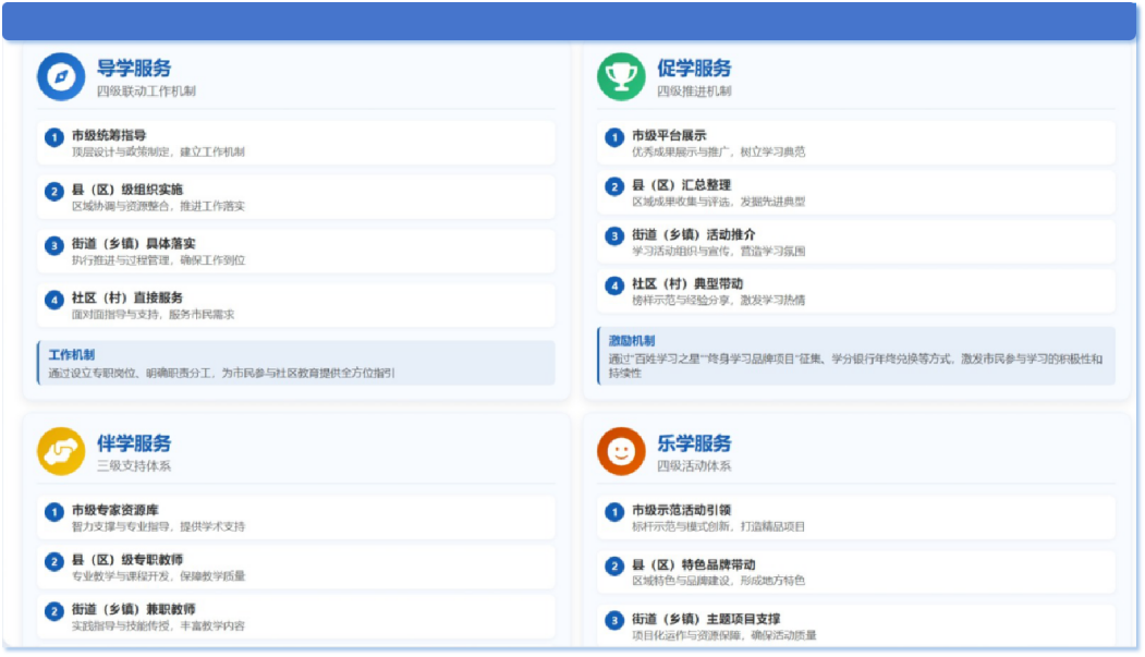 (一)构建“四学”体系,让服务“精准滴灌”。学校聚焦市民学习过程中的实际需求,构建了以“导学、促学、伴学、乐学”为核心的社区教育支持服务模式。在“导学”服务方面,建立了市级统筹指导、县(区)级组织实施、街道(乡镇)具体落实、社区(村)直接服务的四级联动工作机制,通过设立专职岗位、明确职责分工,为市民参与社区教育提供全方位指引。在“促学”激励方面,形成了市级平台展示、县(区)汇总整理、街道(乡镇)活动推介、社区(村)典型带动的四级推进机制,通过“百姓学习之星”“终身学习品牌项目”征集、学分银行年终兑换等方式,激发市民参与学习的积极性和持续性。在“伴学”支持方面,构建了以市级专家资源库为智力支撑、县(区)级专职教师与街道(乡镇)兼职教师为服务主体、社区(村)学习共同体为组织基础的服务体系。在“乐学”体验方面,打造了市级示范活动引领、县(区)特色品牌带动、街道(乡镇)主题项目支撑、社区(村)兴趣社团普及的四级活动体系,通过内容丰富、形式多样的学习活动,让市民在愉悦体验中感受学习乐趣、提升生活品质。