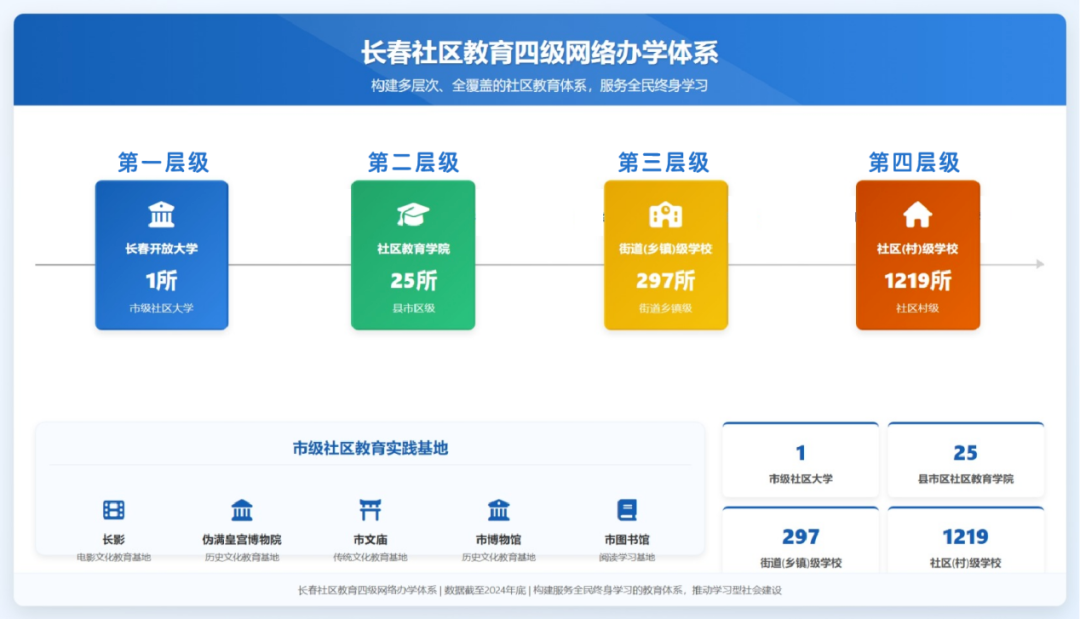 (二)网络织密通末梢,实现供给“零距离”。组织体系是社区教育的“神经网络”。学校作为全市唯一一所社区大学,系统性重建、升级、拓展了市、区、街、社四级办学体系。“十四五”期间,一个覆盖全市的社区教育集群逐步建成,该体系以1所社区大学为统领、25所社区教育学院为骨干、297所街道(乡镇)学校为支撑、1219所社区(村)学校为基础,共计1542所院校共同构成了一张脉络相通、运行高效的终身学习服务网络。这一体系不仅实现了对长春市所有行政区的全面覆盖,更通过“市级统筹、分级管理、资源下沉”的运行机制,将优质教育服务精准输送至城乡社区,切实拓宽了教育公平与社会融合的受益范围。