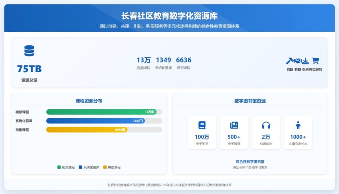 通过自建、共建、引进、购买服务等多元化途径,学校系统构建了资源总量已达75TB的社区教育数字化资源库,涵盖13万集视频课程、1349门系统化慕课、6636集微型课程,以及包含百万册电子图书、500余种电子报纸、2万集有声读物、千余册儿童有声绘本的综合性数字图书馆。所有资源实现在线动态更新与多终端自适应,确保学习者能够随时随地获取所需内容,真正实现“资源在手,学随愿走”。