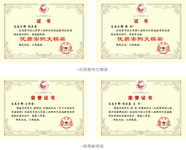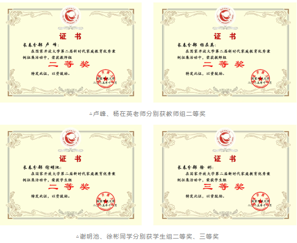 颁奖仪式上,组委会隆重表彰了本届案例征集活动中表现突出的个人与单位。长春开放大学荣获组织奖。我校教师卢峰、杨在英荣获教师组二等奖;学生谢明池(指导教师王斯莹)荣获二等奖,徐彬(指导教师杨在英 王宇)荣获学生组三等奖。教师杨在英荣获教师组优质案例文稿奖,徐彬荣获学生组优质案例文稿奖。这彰显了我校在家庭教育研究与实践、组织动员与指导服务等方面的扎实功底与突出贡献。