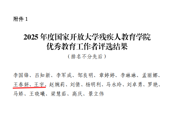 同时,我校王春妍、王宇两位老师获得“2025年度国家开放大学残疾人教育学院优秀教育工作者”荣誉称号。