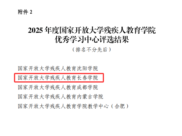 近日,国家开放大学残疾人教育学院 2025 年度优秀学习中心评选结果揭晓,长春开放大学特殊教育学院凭借在残疾人高等教育领域的深耕实践、创新举措与丰硕成果,成功获评“2025 年度国家开放大学残疾人教育学院优秀学习中心”。