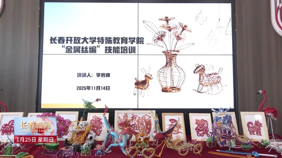 长春开放大学特殊教育学院的教室内,李岩峰正在为学员讲解金属丝编工艺品的制作技艺。李岩峰是一位听障人士,两年前从长春开放大学特殊教育学院毕业后被学校返聘,成为金属丝编、剪纸等课程的主讲教师。