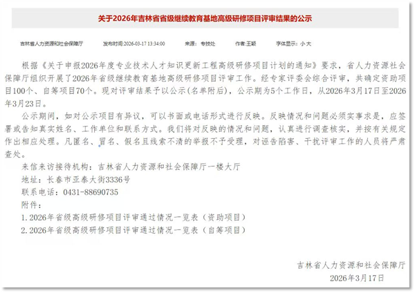 近日,吉林省人力资源和社会保障厅发布2026年省级继续教育基地高级研修项目评审结果公示,我校申报的两个项目成功入选省级资助项目名单,这是我校在专业技术人才培养与继续教育领域的又一重要成果,充分彰显了我校在相关领域的专业实力与办学水平,也标志着我校服务吉林省专业技术人才知识更新工程的能力得到省级主管部门的高度认可,长春开放大学继续教育部已连续四年承办省级专业技术继续高级研修全额资助项目,形成了常态化、体系化的继续教育培养机制。