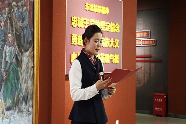 活动特邀我校学员担任讲解员。她们兼具陈列馆专业讲解员与开放大学学员的双重身份,带领师生依次参观各主题展厅。透过一幅幅历史照片、一件件珍贵文物、一段段纪实影像,东北军民十四年抗战的艰苦历程再次呈现。这种沉浸式、场景化的学习体验,使历史从书本文字转化为可感知、可共情的鲜活教材,使师生们在厚重的历史氛围中深刻感悟历史,汲取精神力量。