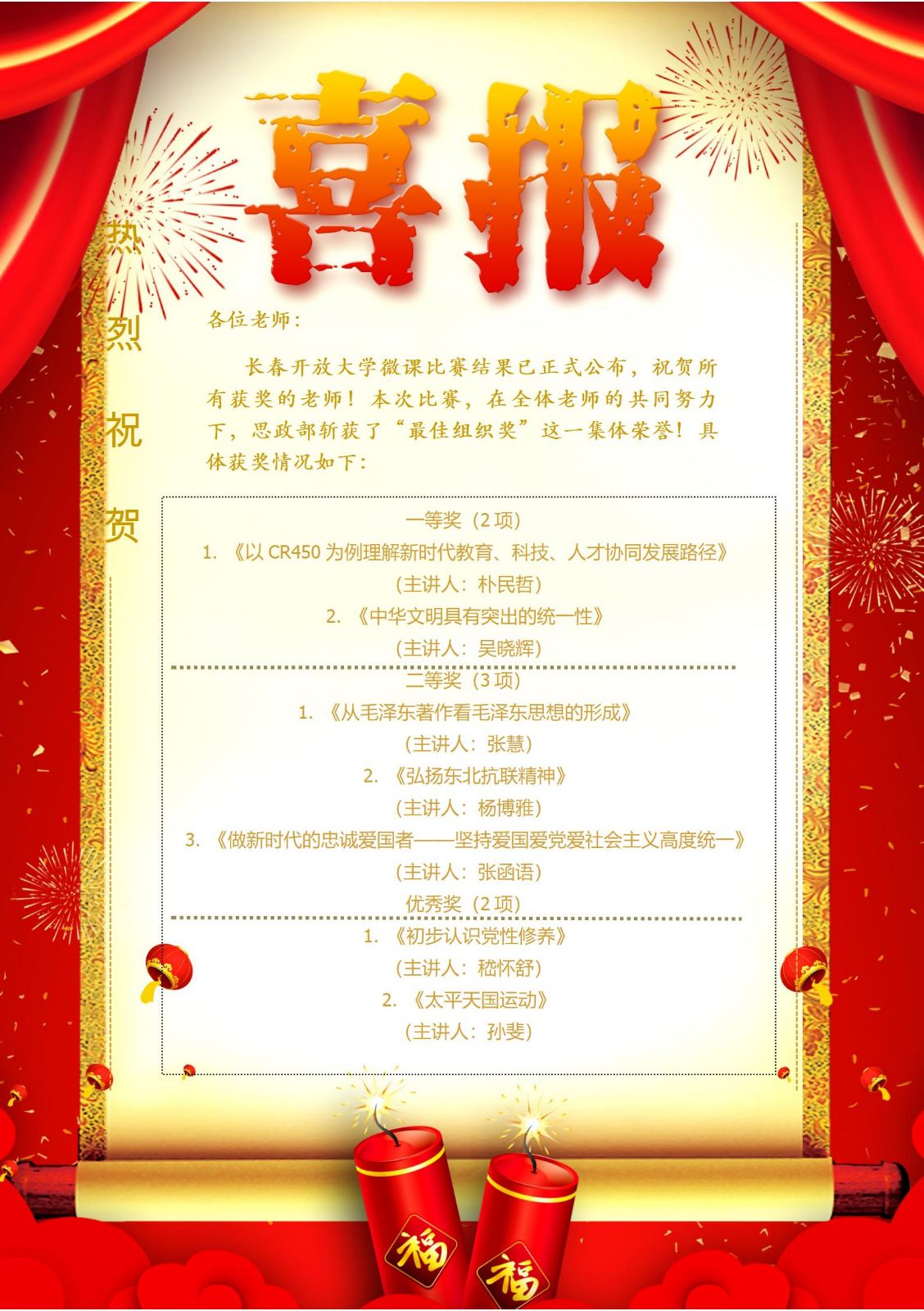 << 下一篇:思政改革结硕果 赛场折桂显真功——我校思政课教师在国家开放大学思政课教学展示活动中斩获佳绩