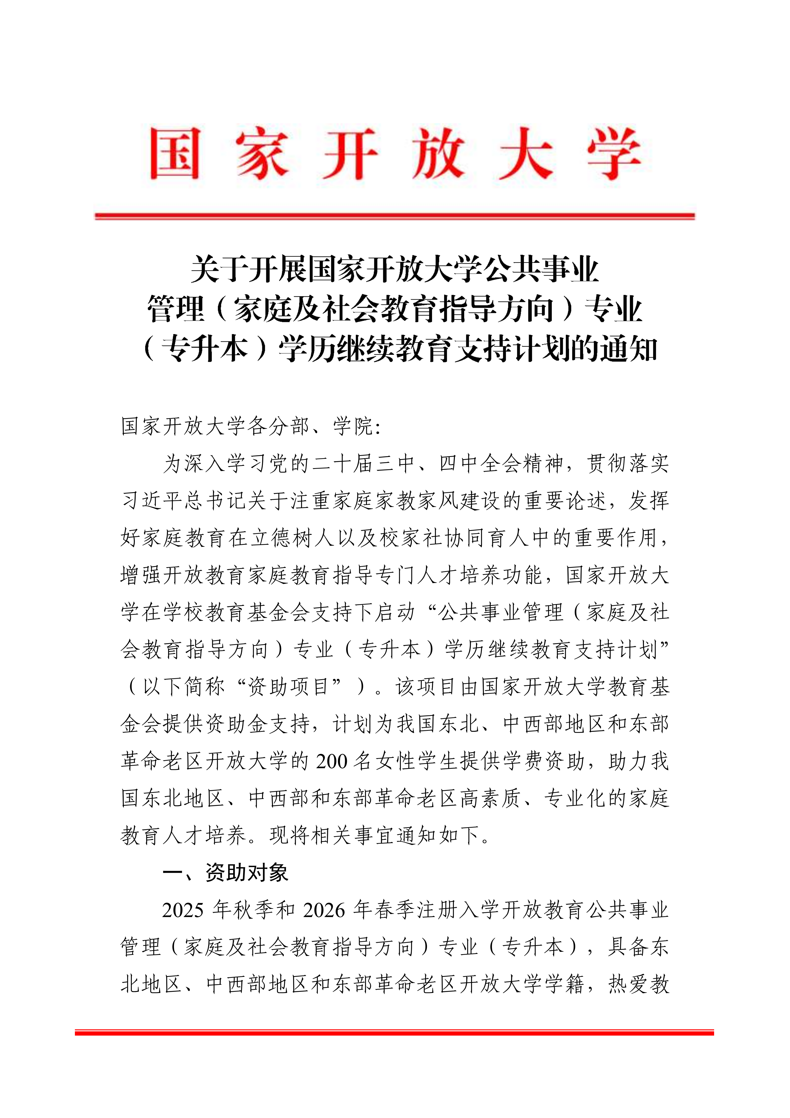 本次资助计划由国家开放大学教育基金会设立,是在深入贯彻党的二十届三中、四中全会精神的背景下启动实施,旨在落实国家关于注重家庭家教家风建设的重要论述,进一步发挥开放教育在培养家庭教育指导人才方面的功能。计划面向东北、中西部和东部革命老区的开放大学女性学生,通过提供学费资助,加强专业化家庭教育人才培养,夯实校家社协同育人的人才基础。