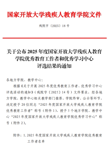 同时,我校王春妍、王宇两位老师获得“2025年度国家开放大学残疾人教育学院优秀教育工作者”荣誉称号。